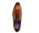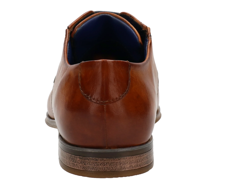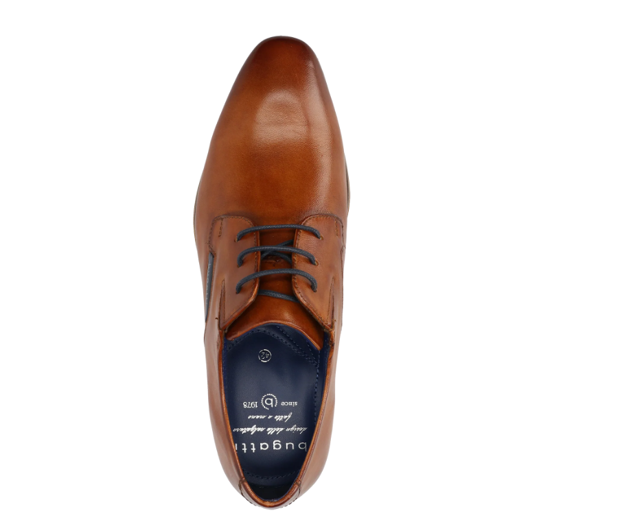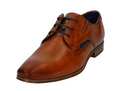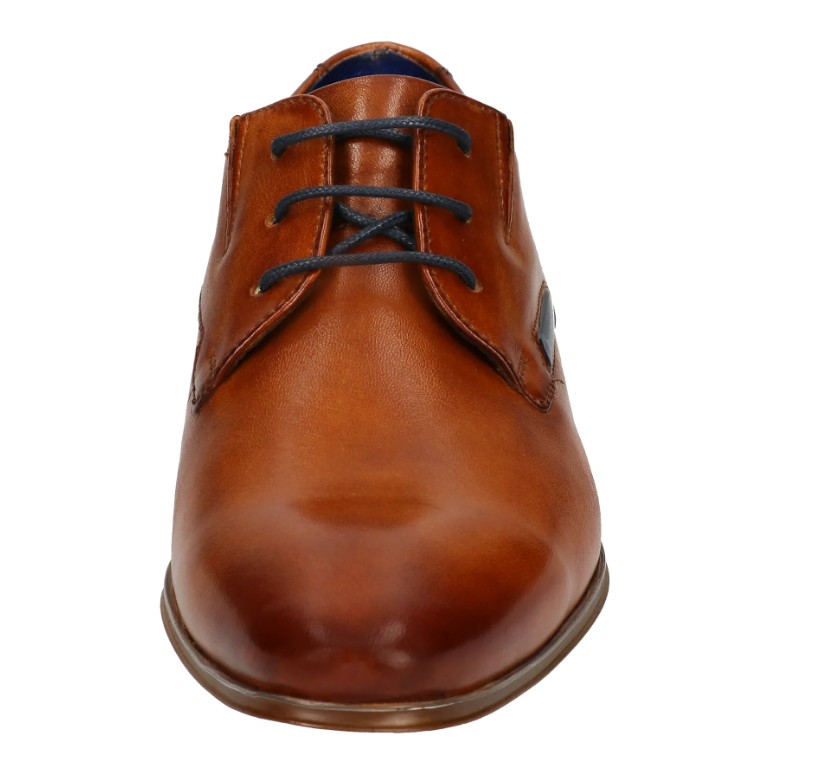 Every business wardrobe needs cool, cognac-colored men's shoes. This pair from our bugatti collection elegantly combines accurate lines and a discreet black background logo with an interesting hand finish touch. The slim shoe goes perfectly with any blue suit.