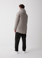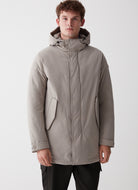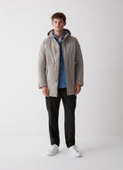 Mid-length men’s jacket with fixed hood made from matt stretch fabric with a water-repellent and waterproof treatment (5,000 mm water column). Natural feather padding. Formal and understated on the exterior, the interior is more alluring with the distinctive "V" quilting made using a highly downproof fabric that does not require seams. A coat with character featuring practical side pockets and functional toggle fastenings on the cuffs that allow you to adjust the width. Versatile and comfortable, it is perfect in urban or elegant occasions.