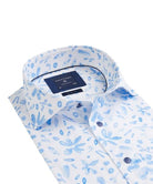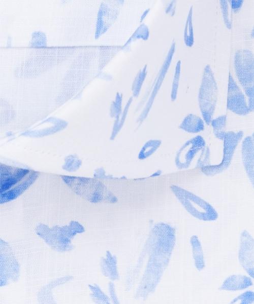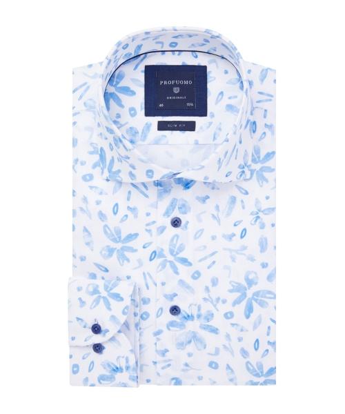 This white poplin shirt has an artistic floral print in a light blue shade and offers a nice alternative to an even coloured shirt. Slim fit, with a single cuff and cutaway collar.