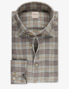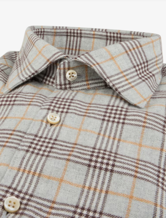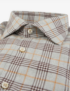 This checked flannel shirt is made of twofold cotton. The shirt is detailed with mother of pearl buttons, single cuffs and a cut away collar.