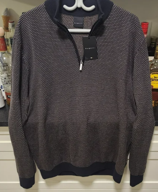 Stylish Bugatti zip-up sweater. Features a black and white pattern. Ideal for casual wear.