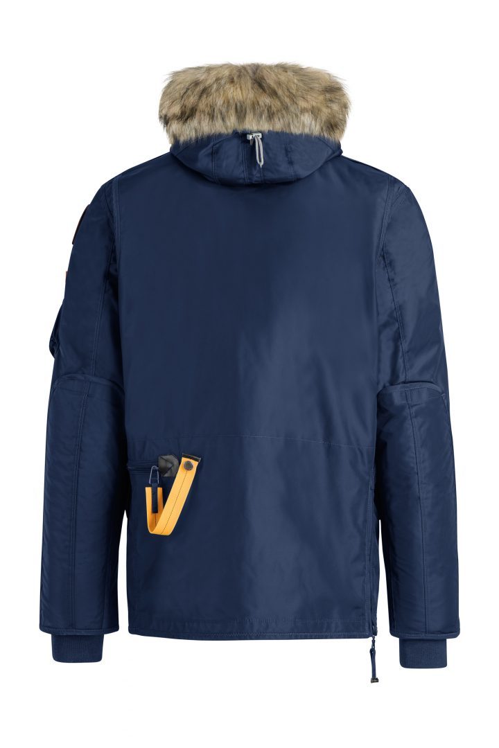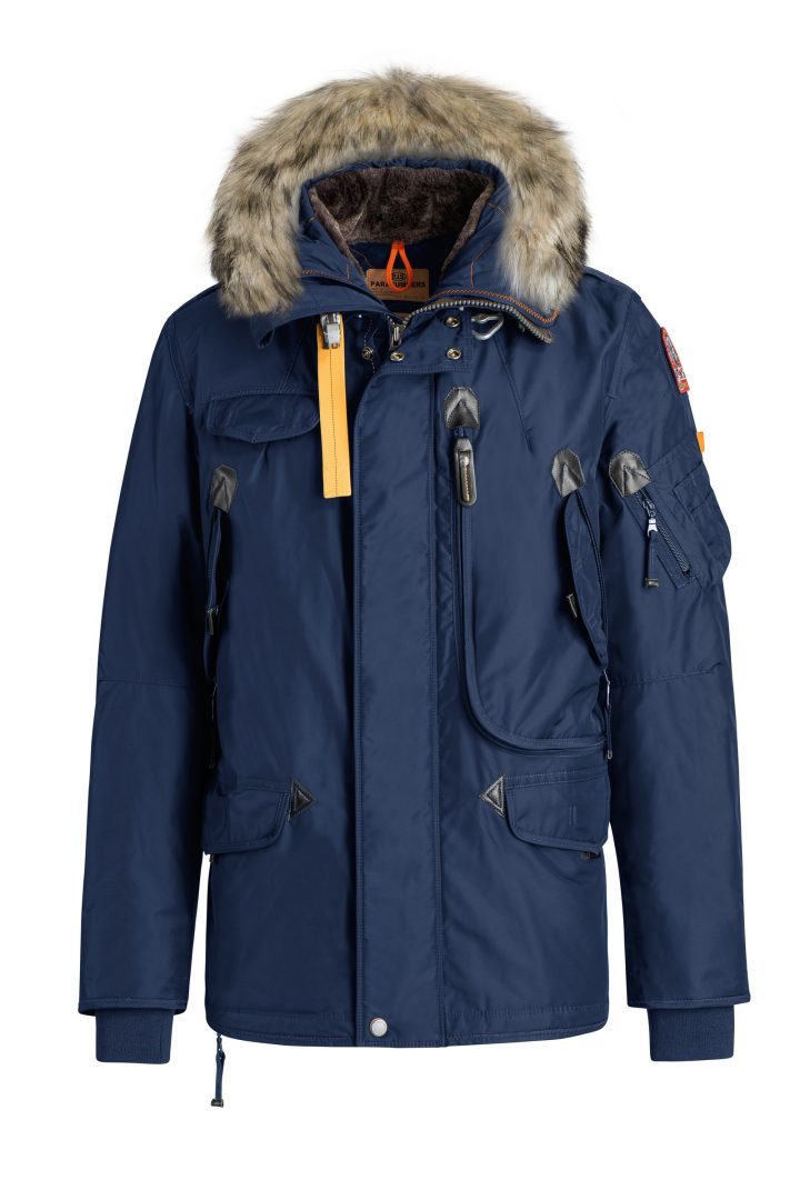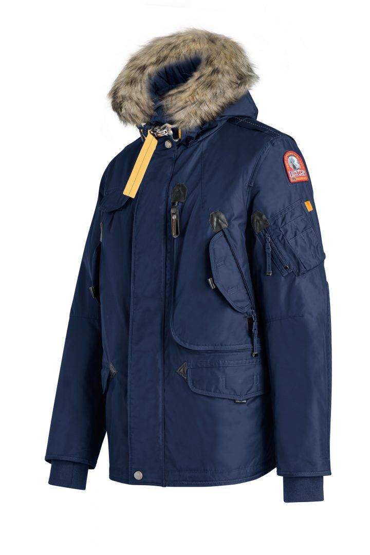 Nylon oxford jacket with a detachable real fur trim around the hood and a removable down-filled lining. The shell fabric has an inner lamination. Taped seams on hood, shoulders and armholes. Multiple pockets include a capacious cargo pocket containing a mesh pocket, and two hand warmer pockets in front, as well as an inner zippered pocket. There is also a zippered pocket on the left sleeve near the PJS patch and the sleeves have reinforced patches at the elbows. The hood is adjustable by means of a tape. Left bottom zippered side slit and elastic waist. Exclusive PJS snap-hook closure and faux shearling inside the neck. Ribbed cuffs. Two-way front zipper with button-up storm flap.