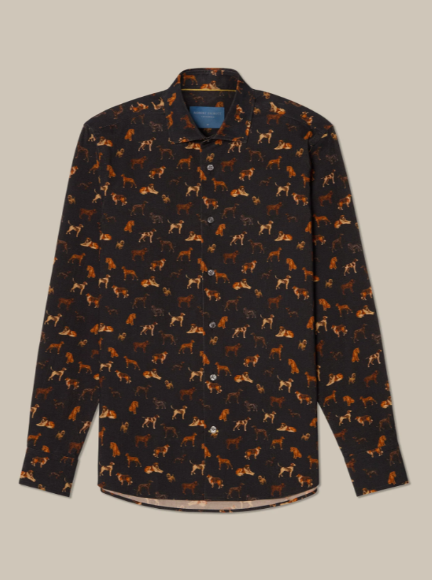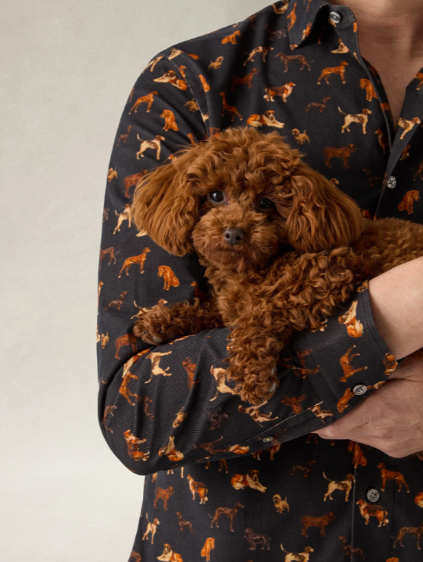 A touch of whimsy with serious craftsmanship. The Reynolds Dog Print Pinwale Corduroy Shirt is made from fine, lightweight corduroy and features an allover dog motif that brings personality to cooler-weather dressing. Designed with a Monterey semi-spread collar, French placket, and single-needle tailoring for a polished yet relaxed feel.