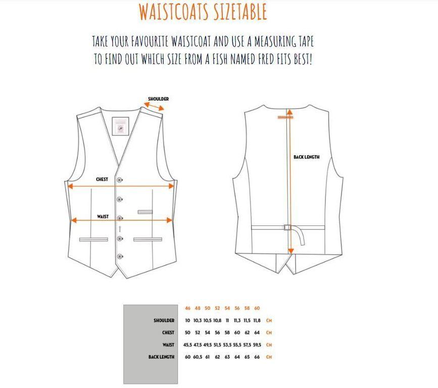 This vest in an off-white check is 20% linen, 32% polyester, and 18% viscose. These vests fit true in a centimeter scale.